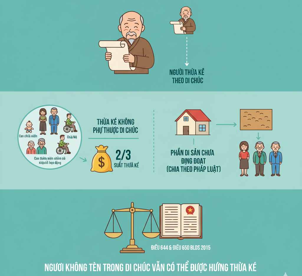 Các trường hợp người không có tên trong di chúc vẫn được hưởng thừa kế Theo Điều 644 Bộ luật Dân sự 2015, những người sau đây sẽ được hưởng thừa kế bằng hai phần ba suất của một người thừa kế theo pháp luật (nếu di sản được chia theo pháp luật), trừ khi họ là những người không được hưởng thừa kế